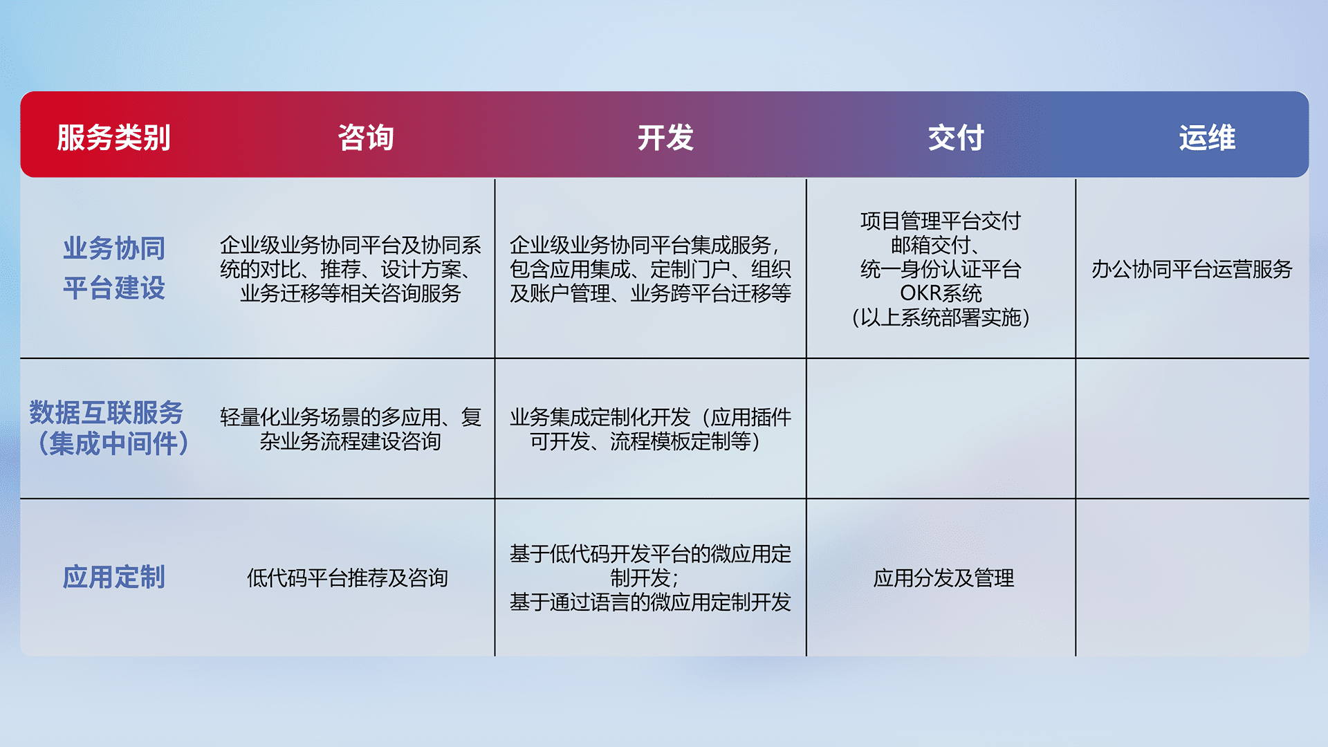 针对钉钉、、、、企微、、IDaas等平台级产品提供产品的规划、、、方案、、交付、、定制化开发等服务,,,,实现如统一协同办公、、、、智能客户服务、、、、混合会议管理、、、、智能数据查询、、等业务场景,,,,实现数字化转型。。。
